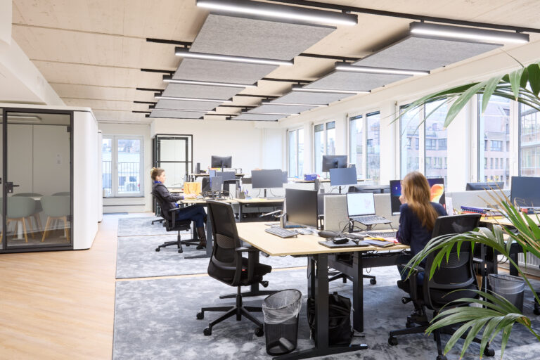 Buroconcept helped bring their vision to life. We removed the standard acoustic ceiling to introduce a modern loft aesthetic while ensuring optimal acoustics in the open space.